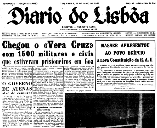 Em Maio de 1962, o navio Vera Cruz zarpava da Índia, transportando os soldados portugueses com destino a Lisboa, enquanto em situação de igualdade de direitos, viajaram para Carachi os prisioneiros da comunidade indiana que se encontravam em Moçambique.